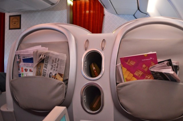 And now, the seat! I didn’t manage to get many photos, but I’ll provide a description. This aircraft had the older style seats, which were just a hair away from being fully flat. They were flat, but slightly angled. The seat cushions themselves were average, but could have been more comfortable. They were fabric, and I don’t think anything can beat Singapore Airlines’ plush leather Business Class. There was great control over seating position, with the ability to adjust the lumbar support, backrest, footrest and seat pan position. The lumbar support had a massage feature which would continuously roll up and down the seat back. A nice touch! There was, however, limited storage around the seat. There was a small compartment mainly for the headphones, but other than that there was nothing in the seat itself. The seat back had a literature pocket, small shoe closet and water bottle holder, but the overall storage was insufficient. There were two reading lights (one adjustable one at shoulder level and one on the ceiling). The cabin itself was incredibly spacious and felt amazing. The bed itself was not bad, but actually not long enough. In a seat position, the legroom is great, but in the bed position, it is a bit limited. I also found myself wanting to keep extending the footrest, however, its maximum extension was not sufficient. In-seat universal power is also provided.