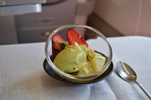 Course 3 was a seared salmon with steamed rice. The sauce was amazing, and the rice had excellent texture for aircraft food!I didn’t enjoy the actual salmon as much, and think that more sauce would have made the dish better. The vegetables were alright, but a little hard:
