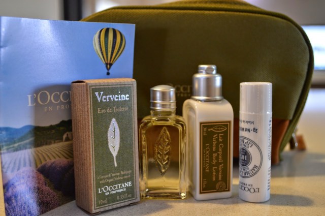 The L’Occitane products: Verveine Eu de Toilette, Verbena Body Lotion, Lip Balm