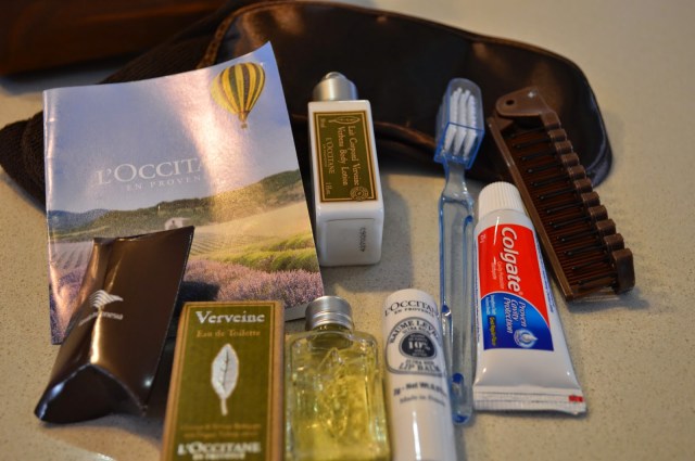 The contents: Eye mask, socks, toothbrush, toothpaste, comb/brush, ear plugs, Verveine Eu de Toilette, Verbena Lotion, Lip Balm