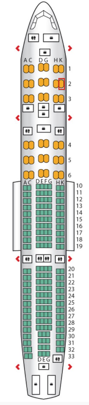 The aircraft today was an Airbus A330-243, registered PK-GPI. It’s first flight was 12 October 2009, making it 5 years old. GA separates the aircraft into 4 cabins: 2 Business cabins (each with 3 rows), and 2 Economy cabins. I was seated in 7K today. In reality, this seat is numbered 7K, however, the map below shows it as 2K. I am yet to understand why some aircraft are numbered in this way. I’ve flown other aircraft where the first row is row 11, and I simply don’t see why!