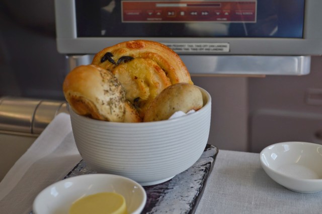 Garuda uses beautiful cutlery and crockery for all meals in Business. The bread basket is served on a glass tray with a smeared dark purple accent. Three warm breads were provided, all of which had amazing flavour!