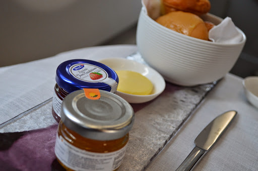 I do adore the cutlery and crockery GA uses. The plates and bowls are incredibly modern and stylish. At the commencement of the service, the crew lays the table with a table-cloth and places down a lovely stained-glass plate for the pastries and preserves.